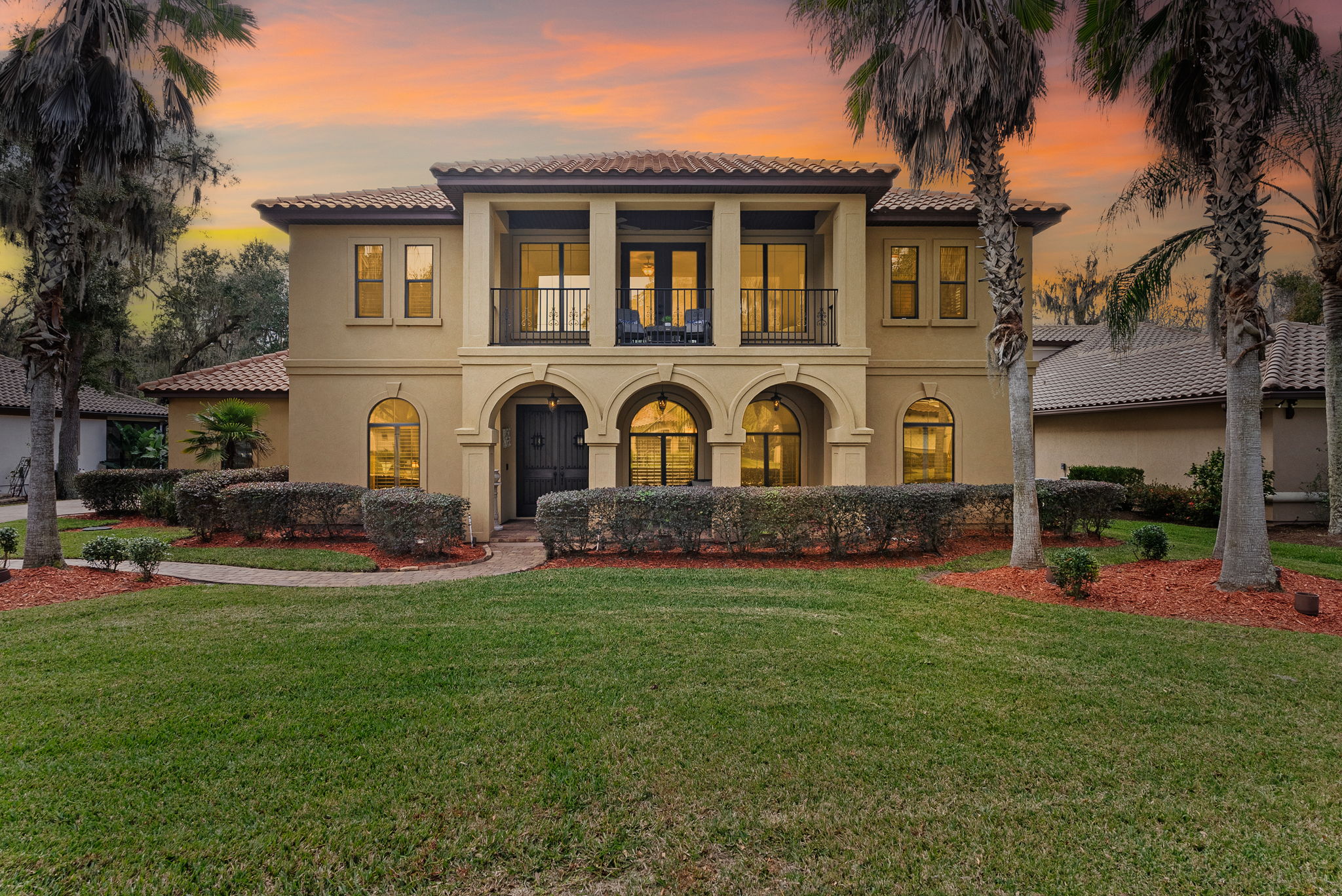 Set within the exclusive gated enclave of Villa Sovana, this luxury Mediterranean-inspired custom residence offers refined indoor-outdoor living with timeless architectural character and a classic barrel-tile roof. A striking arched double-door entry with iron-accented custom elegant doors opens to a dramatic 24-foot great room with grand staircase, artisan ironwork, plantation shutters throughout, and statement powder room with a handcrafted glass vessel sink set on Tuscany inspired tiles and expansive windows that fill the home with natural light. A gourmet kitchen anchors the main level with custom cabinetry, stone countertops, oversized island seating, and seamless flow to the dining and living areas.